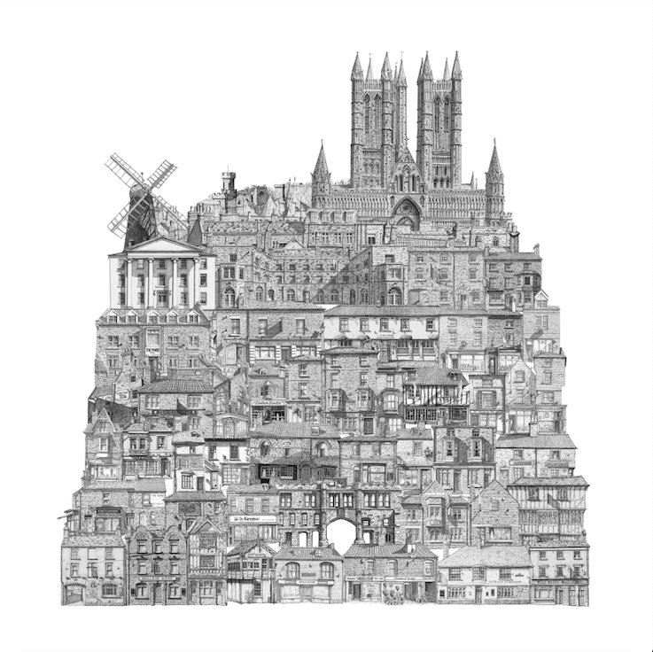 Each building has been hand-drawn with pen and paper, then carefully scanned and digitally assembled to create this stunning composition.